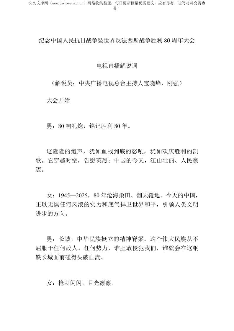 纪念中国人民抗日战争暨世界反法西斯战争胜利80周年大会电视直播解说词(9.3阅兵解说词)