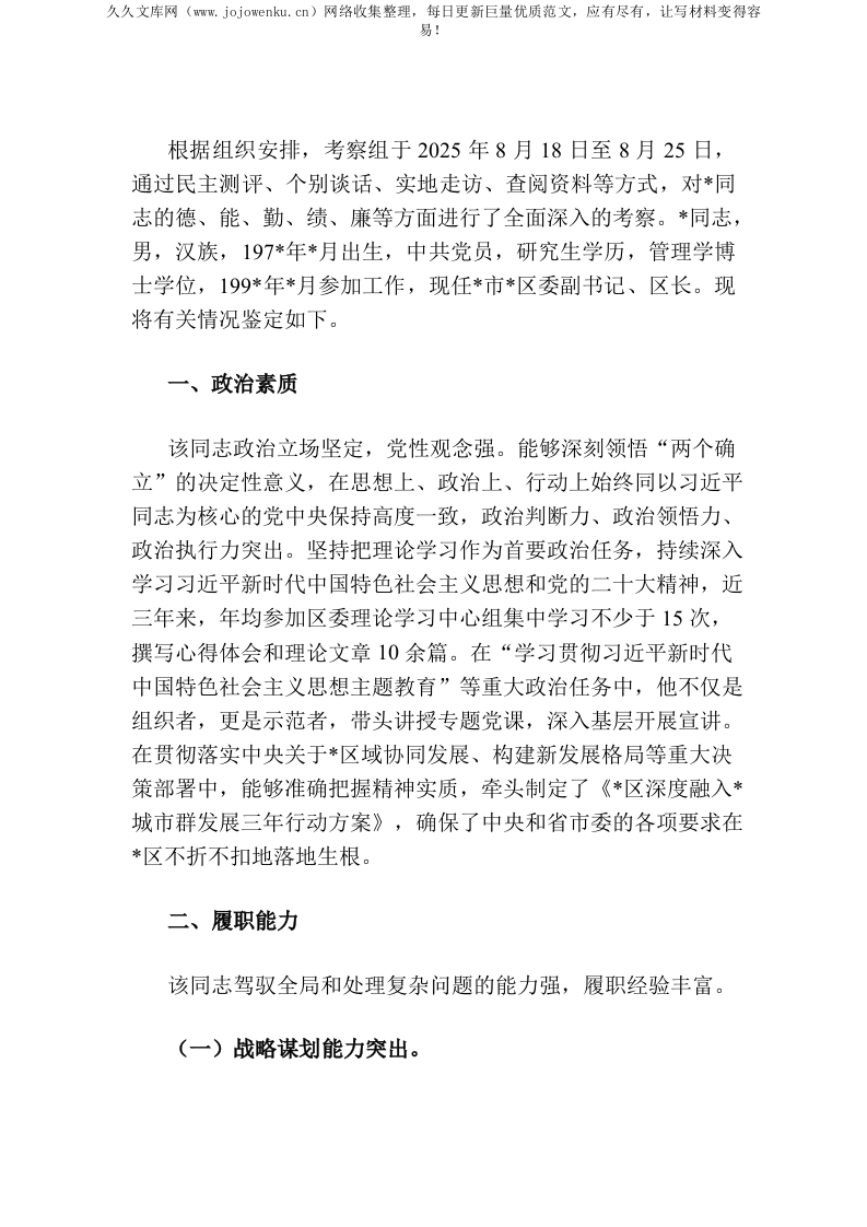 首页公文大全申请入党等党务材料考察材料2025年领导干部政治鉴定材料