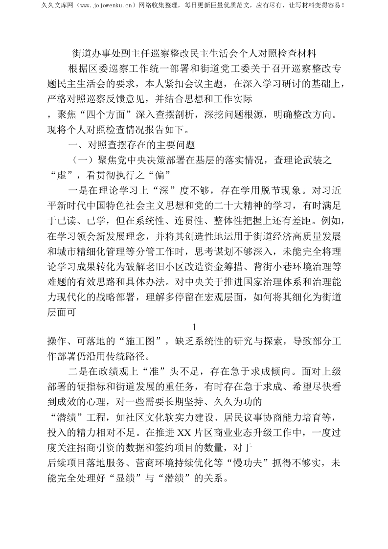 街道办事处副主任巡察整改民主生活会个人对照检查材料