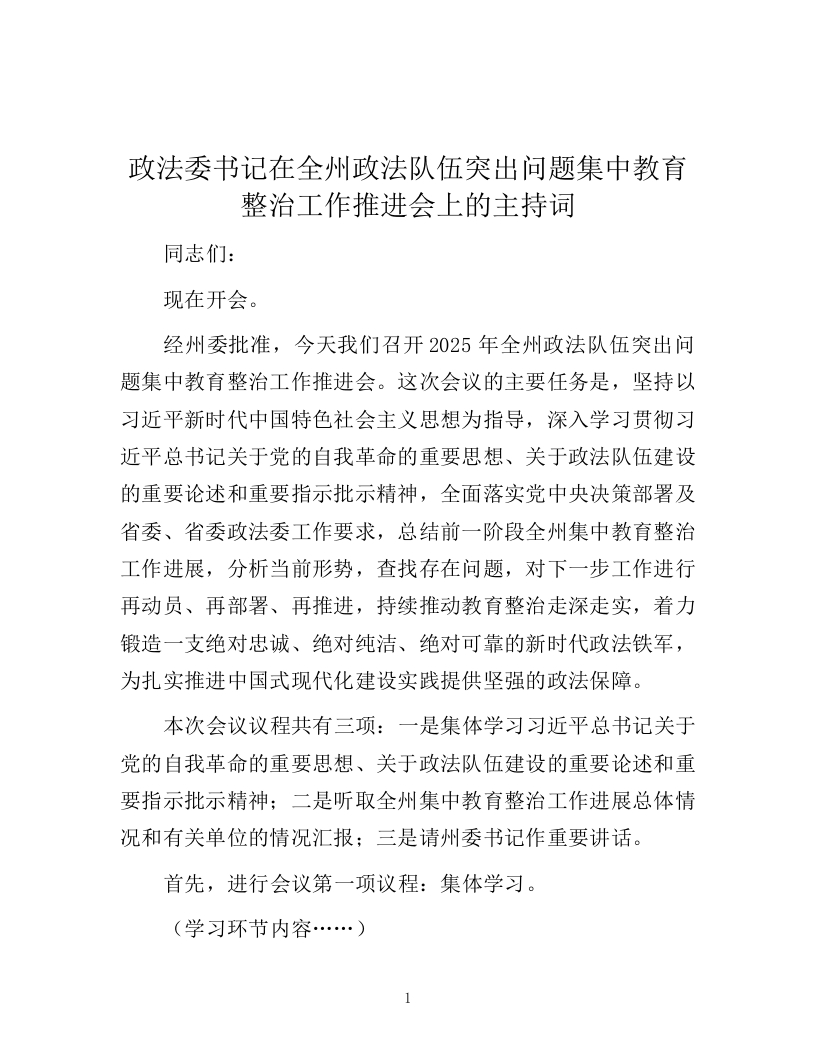 政法委书记在全州政法队伍突出问题集中教育整治工作推进会上的主持词