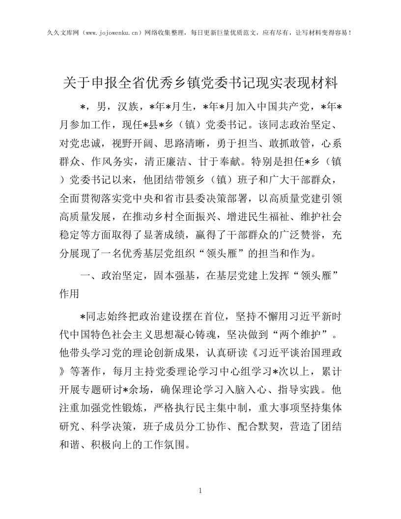 关于申报全省优秀乡镇党委书记现实表现材料