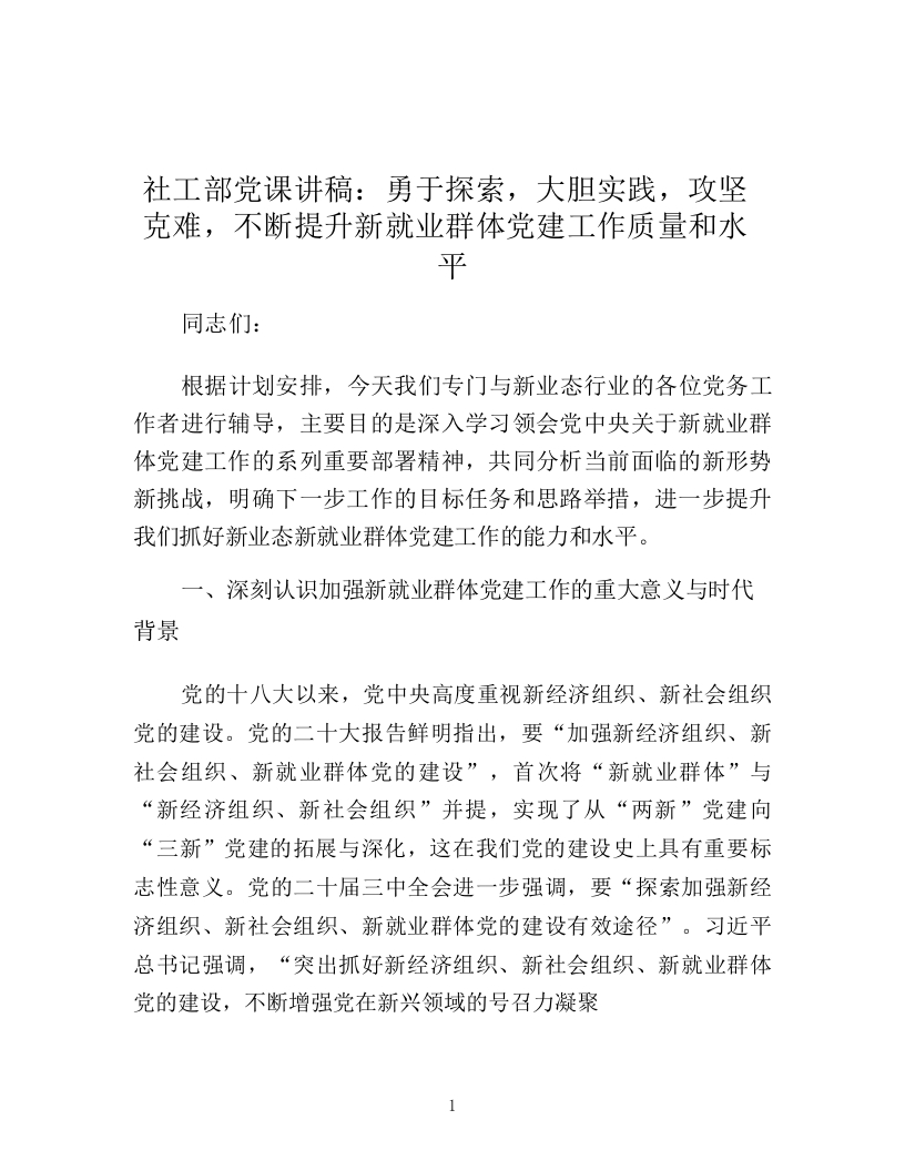 社工部党课讲稿:勇于探索,大胆实践,攻坚克难,不断提升新就业群体党建工作质量和水平