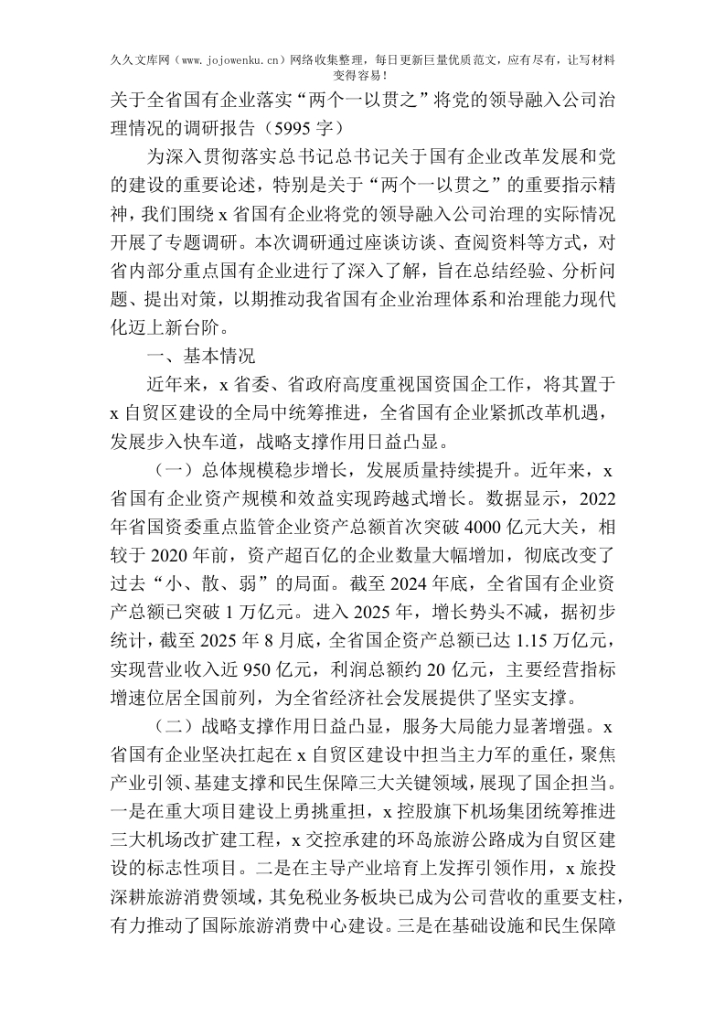 关于全省国有企业落实“两个一以贯之”将党的领导融入公司治理情况的调研报告(5995字)