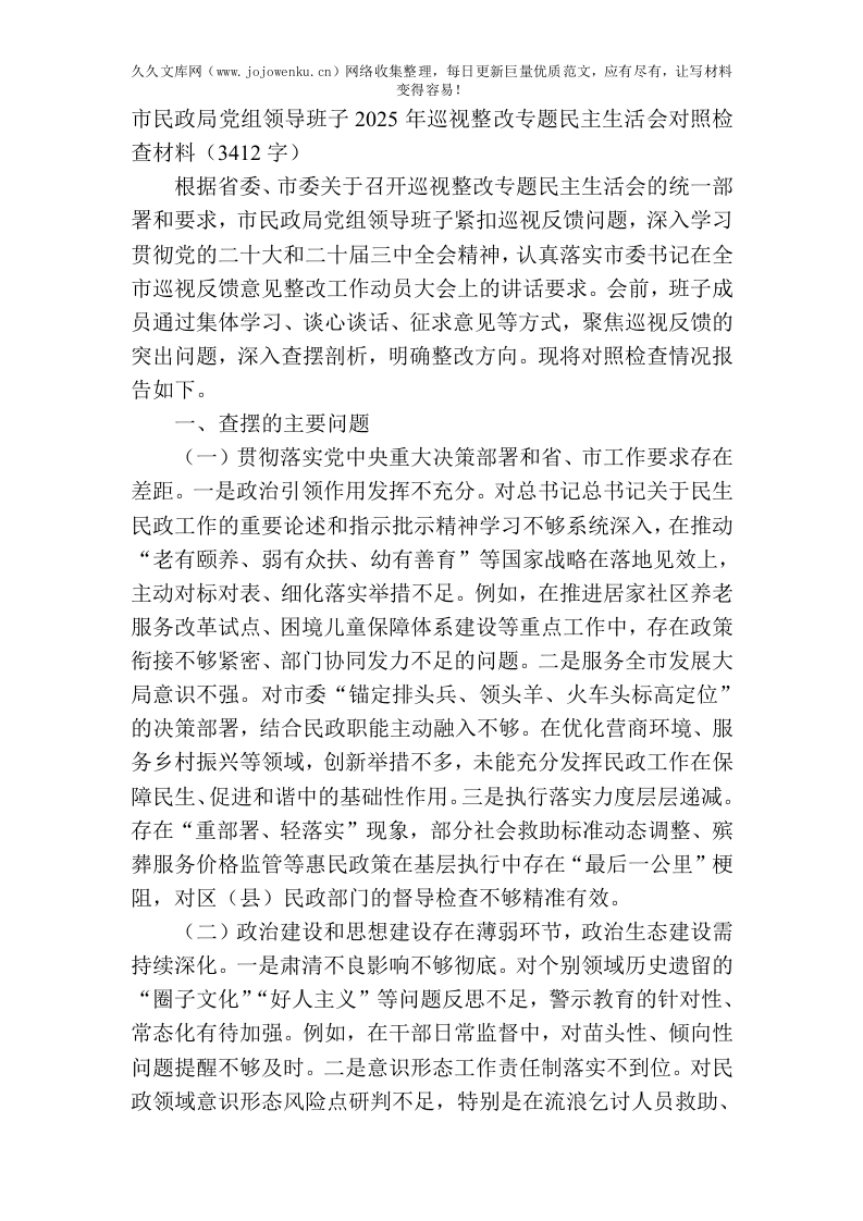 首页公文大全对照检查市民政局党组领导班子2025年巡视整改专题民主生活会对照检查材料(3412字)