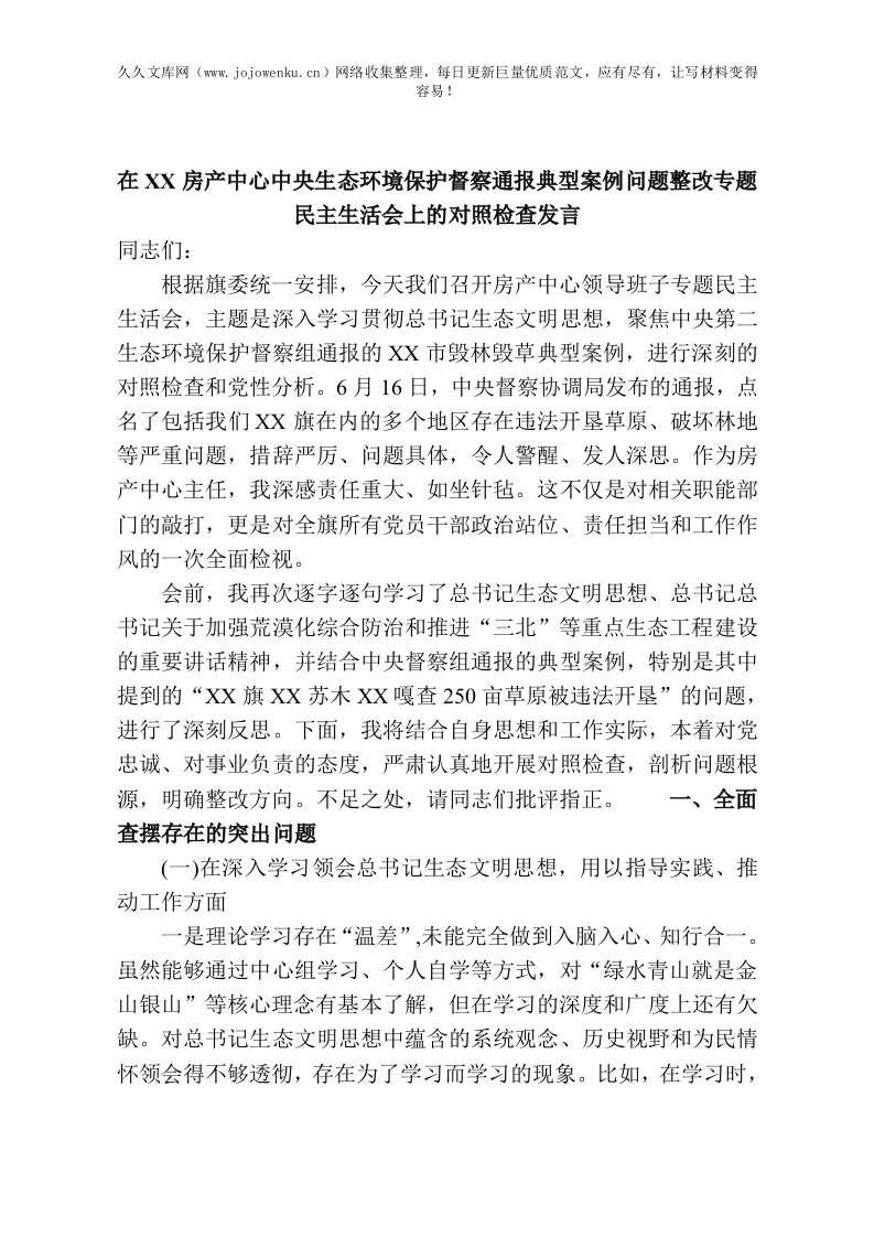 央生态环境保护督察通报典型案例问题整改专题民主生活会上的对照检查发言