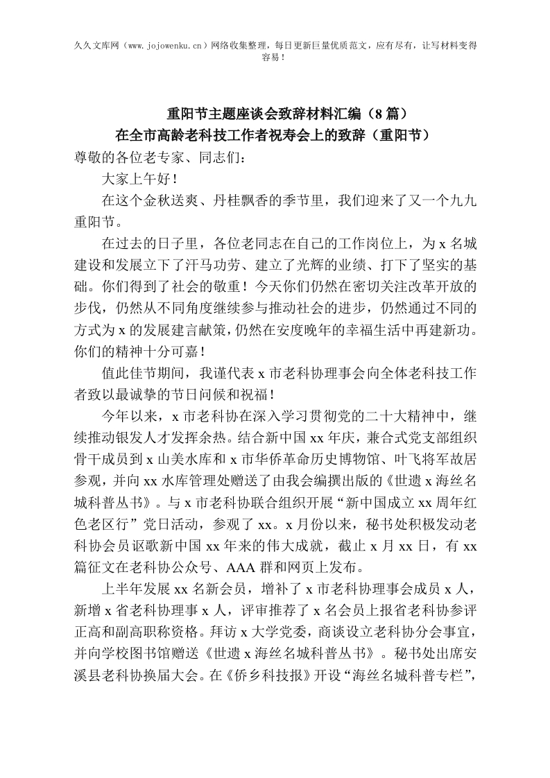 重阳节主题座谈会致辞材料汇编(8篇)