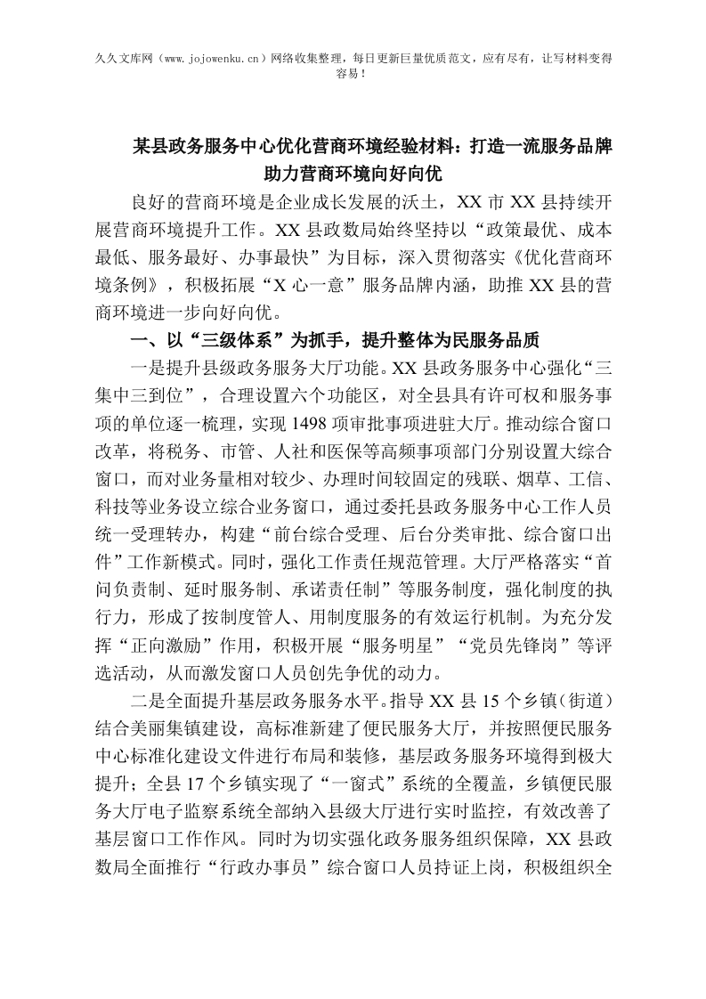 某县政务服务中心优化营商环境经验材料:打造一流服务品牌助力营商环境向好向优