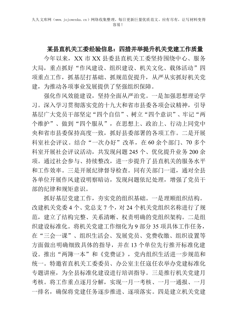 某县直机关工委经验信息:四措并举提升机关党建工作质量