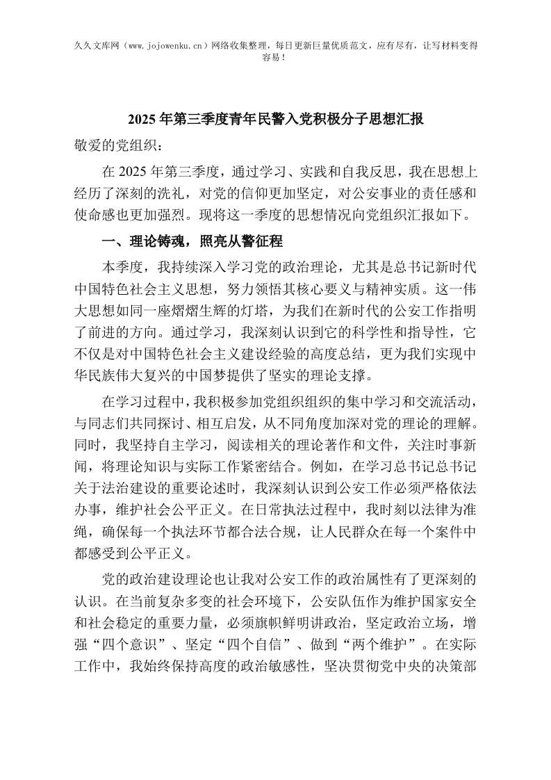 首页公文大全申请入党等党务材料思想汇报2025年第三季度青年民警入党积极分子思想汇报