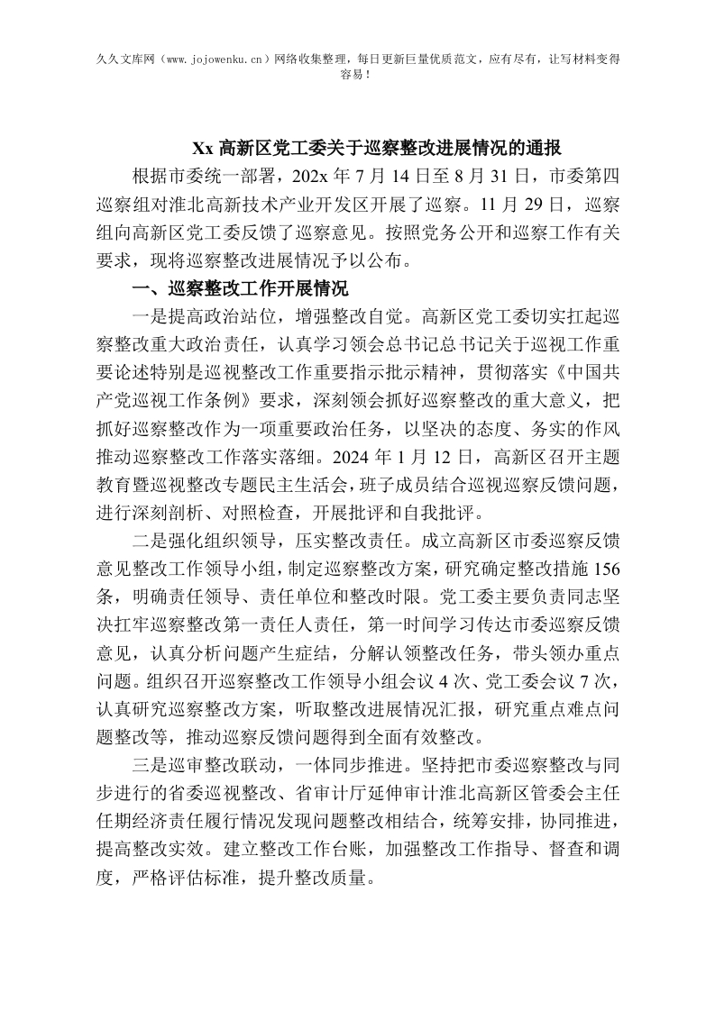 Xx高新区党工委关于巡察整改进展情况的通报
