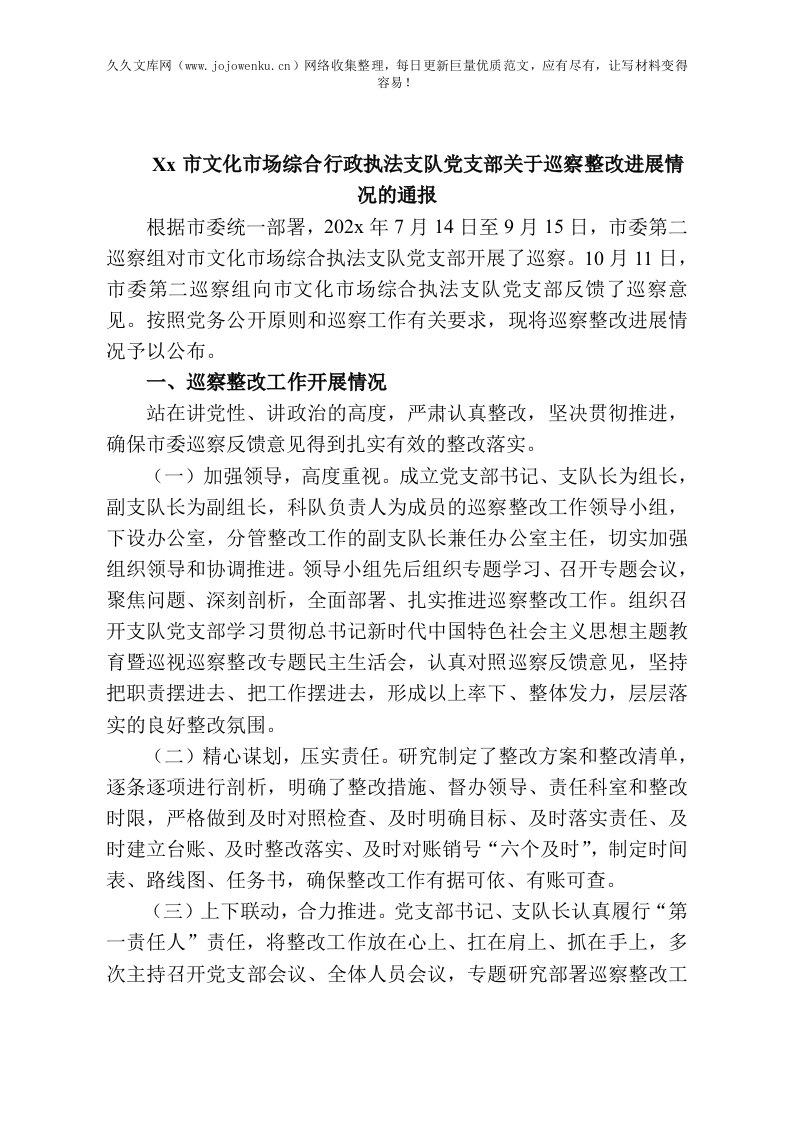 Xx市文化市场综合行政执法支队党支部关于巡察整改进展情况的通报