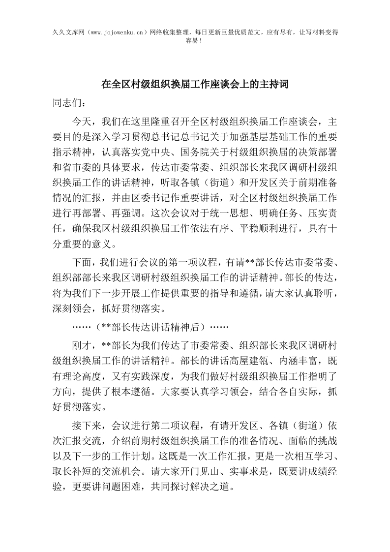 首页公文大全主持辞及其他公文主持词在全区村级组织换届工作座谈会上的主持词