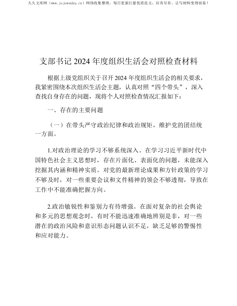 首页公文大全对照检查支部书记2024年度组织生活会对照检查材料_PD