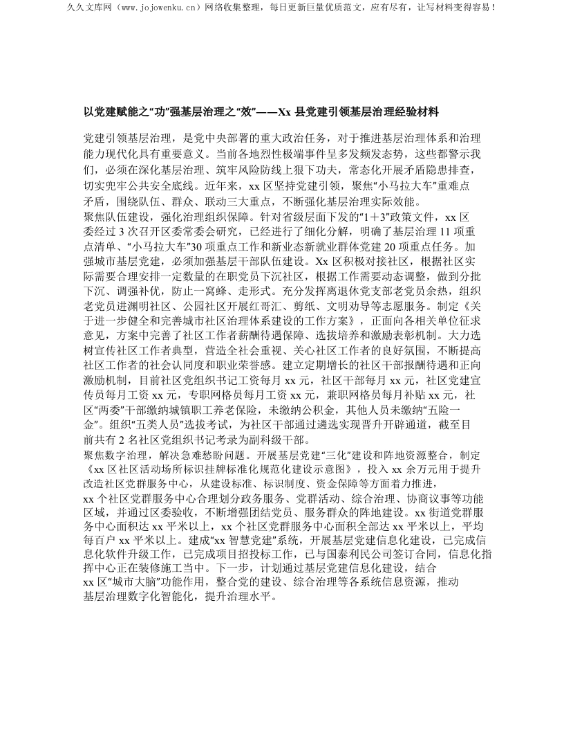 以X建赋能之“功”强基层治理之“效”——Xx县X建引领基层治理经验材料