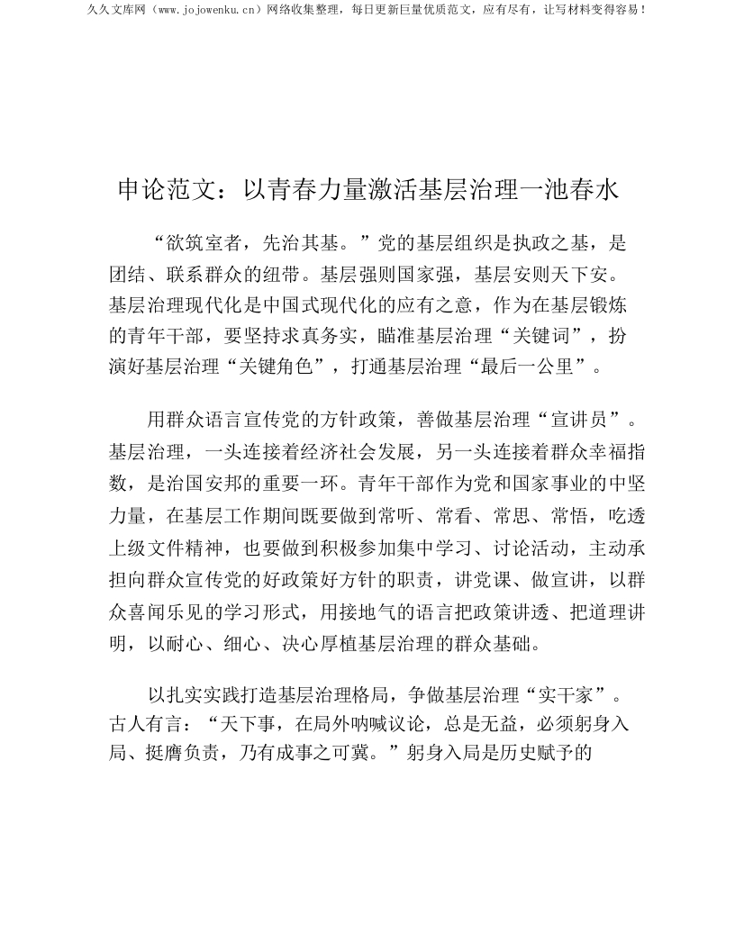 申论范文:以青春力量激活基层治理一池春水