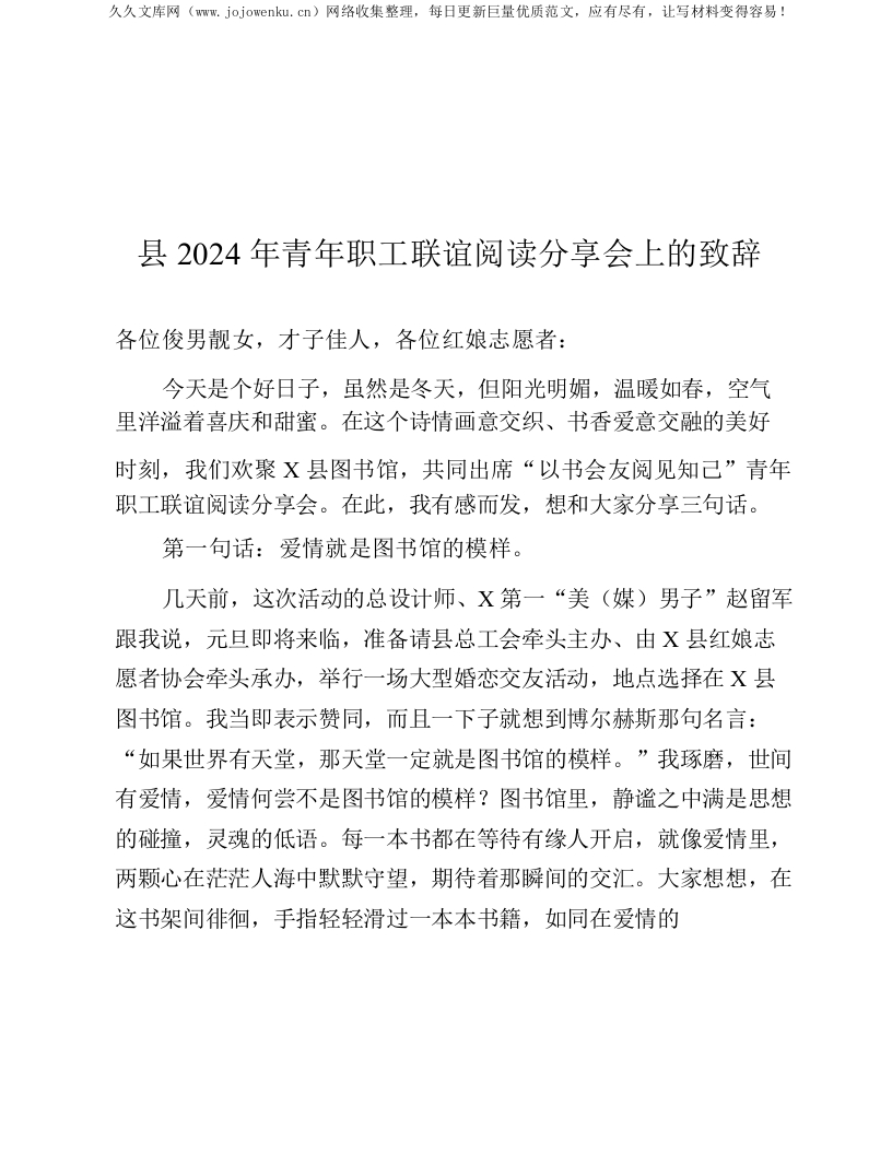 县2024年青年职工联谊阅读分享会上的致辞
