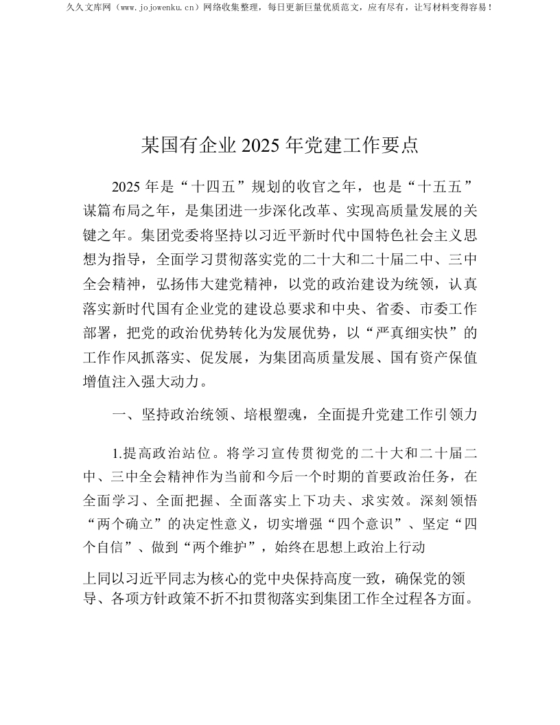 首页公文大全计划方案、要点某国有企业2025年X建工作要点