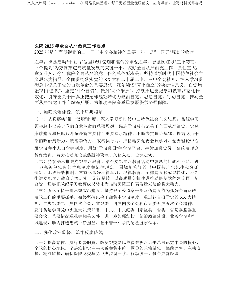 首页公文大全计划方案、要点医院2025年全面从严治X工作要点