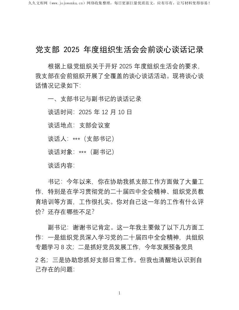 党支部2025年度组织生活会会前谈心谈话记录