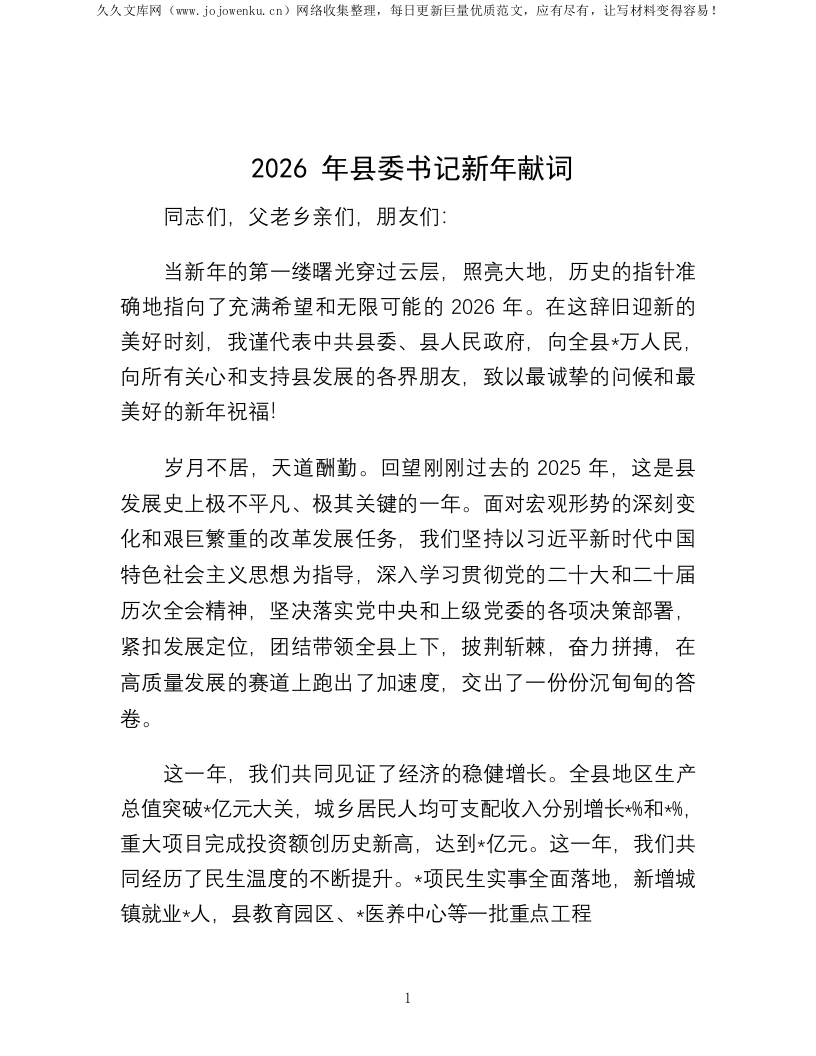 首页公文大全主持辞及其他公文贺信2026年县委书记新年献词