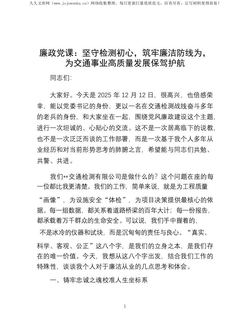 首页公文大全党课讲稿 廉政党课:坚守检测初心,筑牢廉洁防线为,为交通事业高质量发展保驾护航