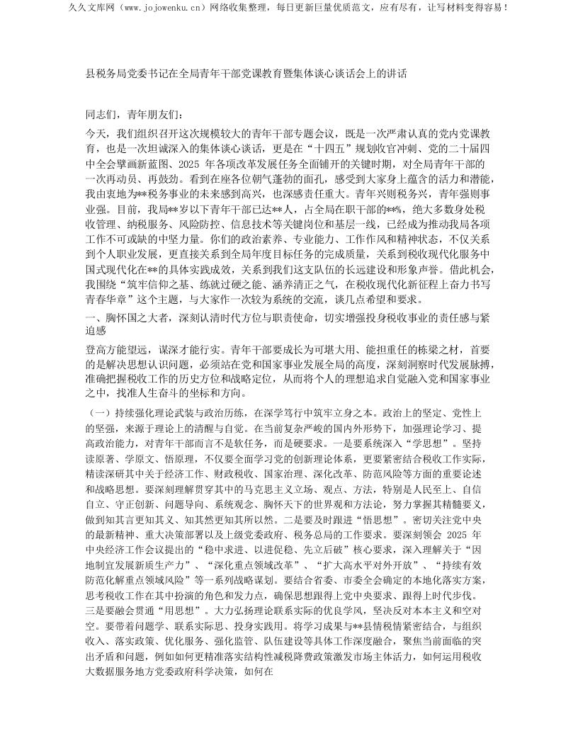 县税务局党委书记在全局青年干部党课教育暨集体谈心谈话会上的讲话​