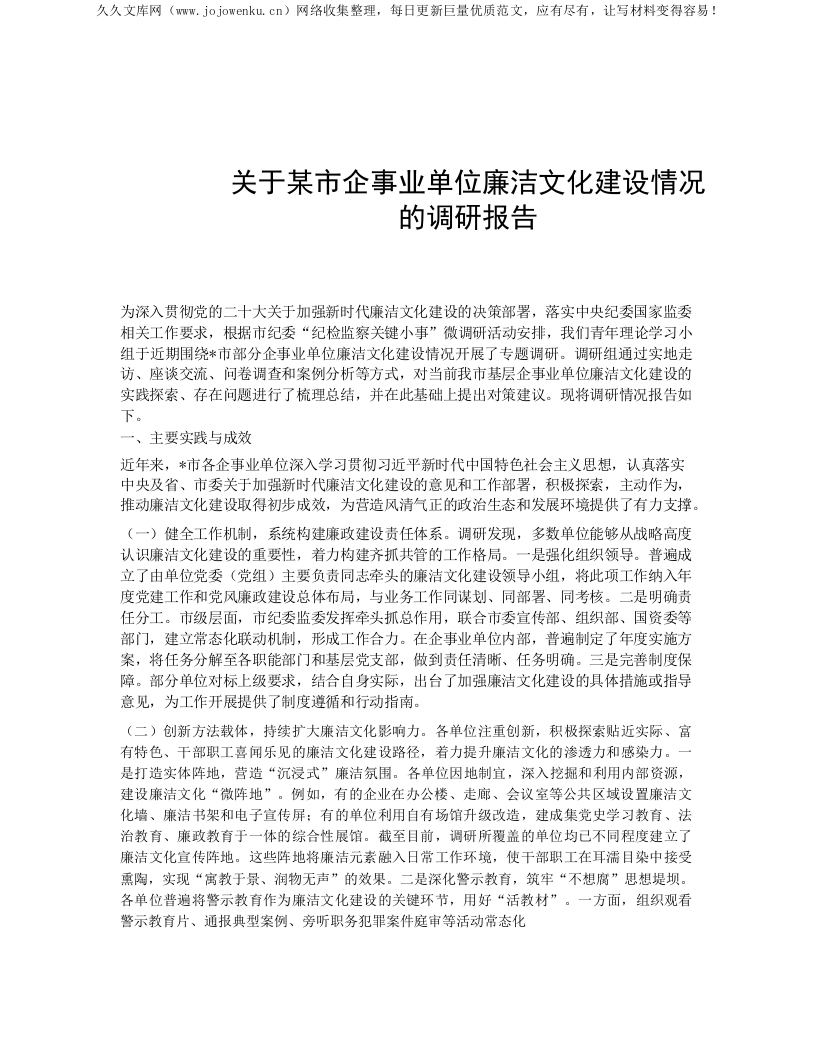 关于某市企事业单位廉洁文化建设情况的调研报告
