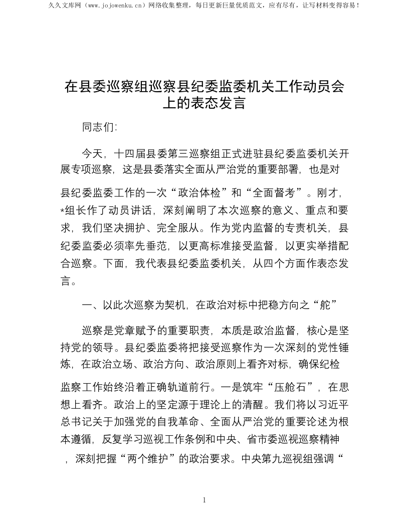在县委巡察组巡察县纪委监委机关工作动员会上的表态发言