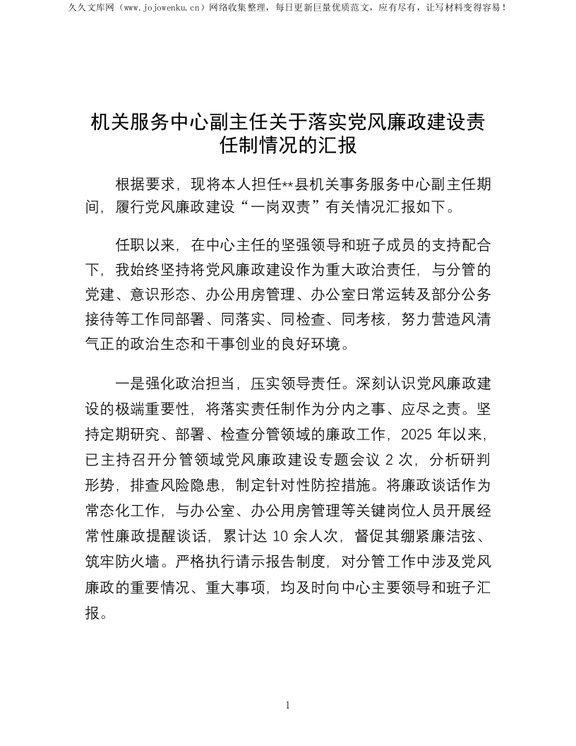 机关服务中心副主任关于落实党风廉政建设责任制情况的汇报