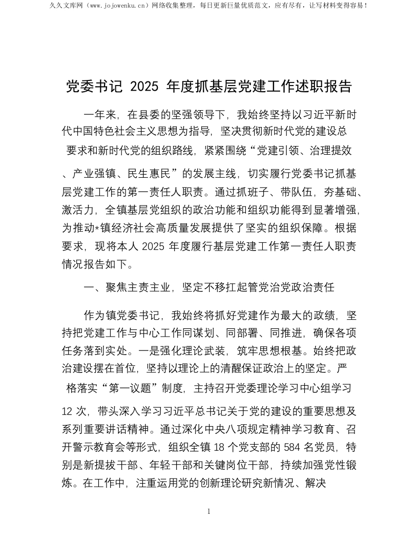 首页公文大全述职述廉党委书记2025年度抓基层党建工作述职报告