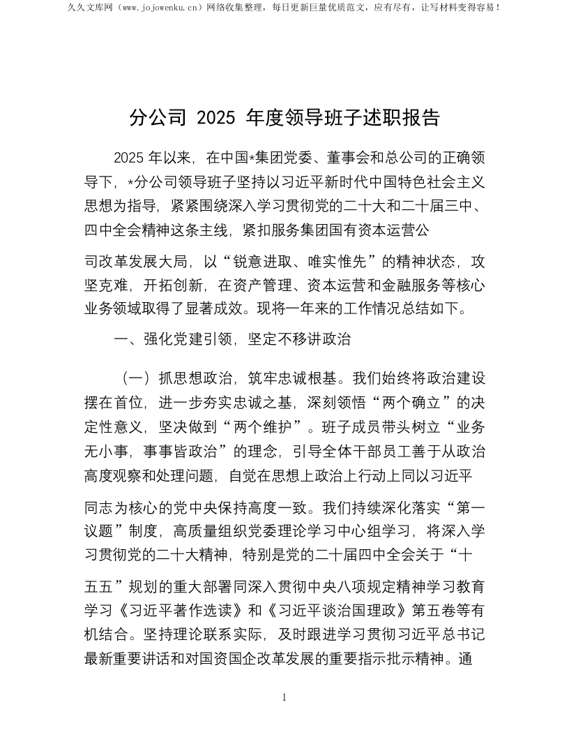 分公司2025年度领导班子述职报告