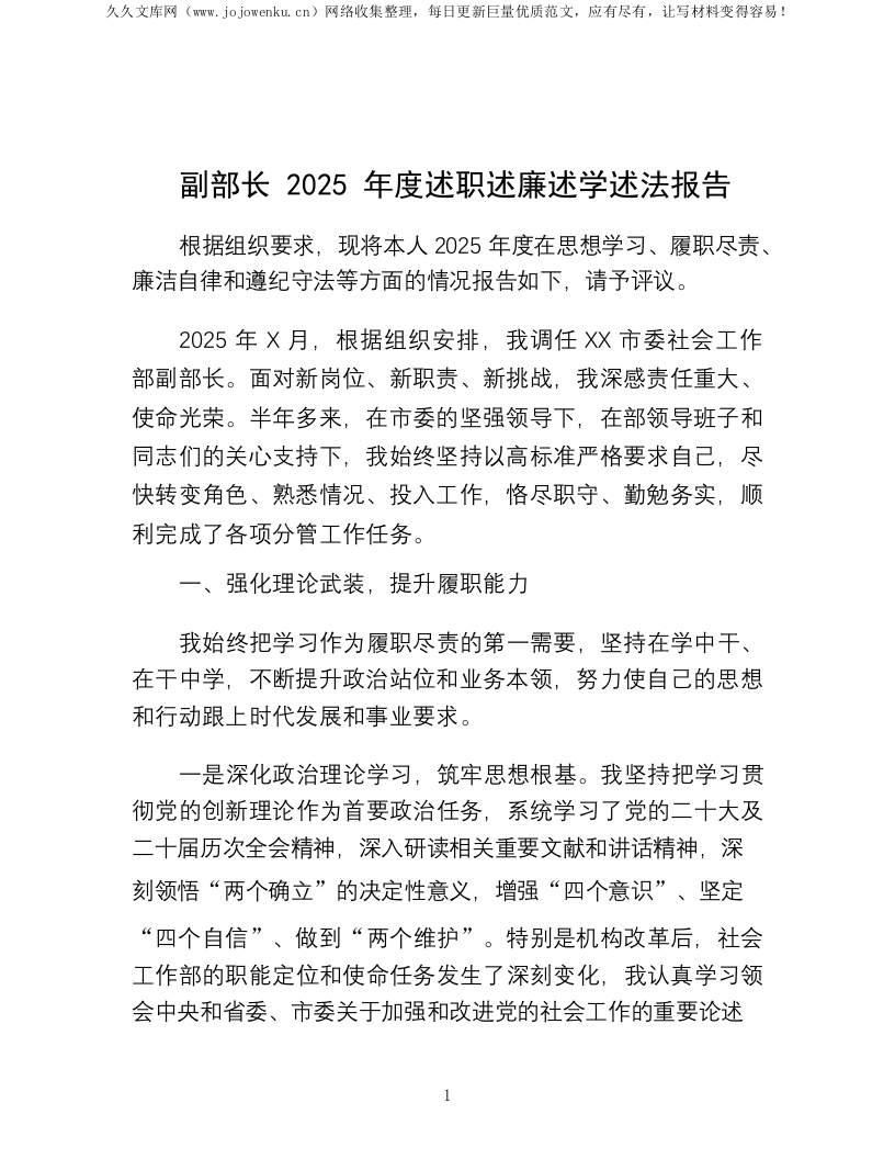 副部长2025年度述职述廉述学述法报告