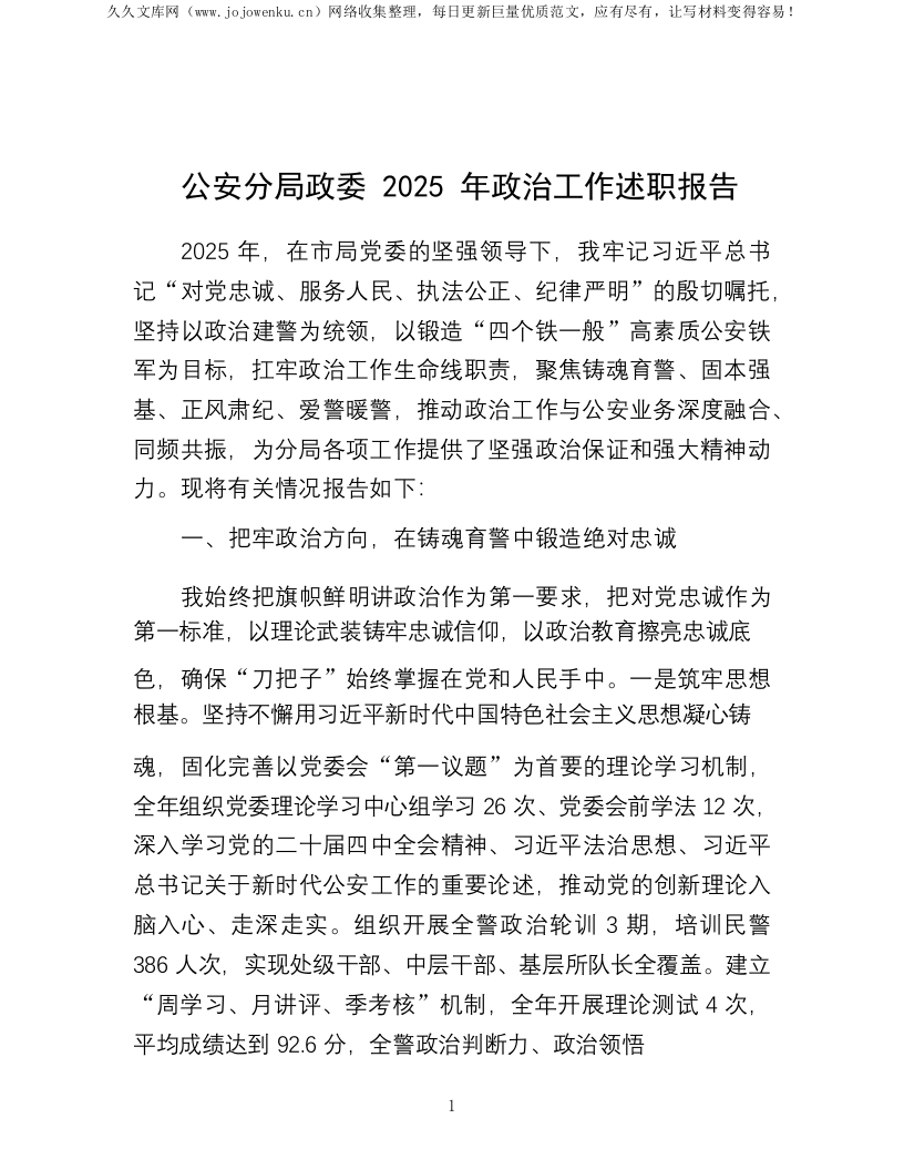 首页公文大全述职述廉公安分局政委2025年政治工作述职报告