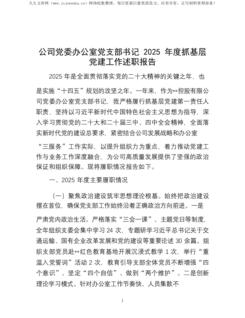 公司党委办公室党支部书记2025年度抓基层党建工作述职报告
