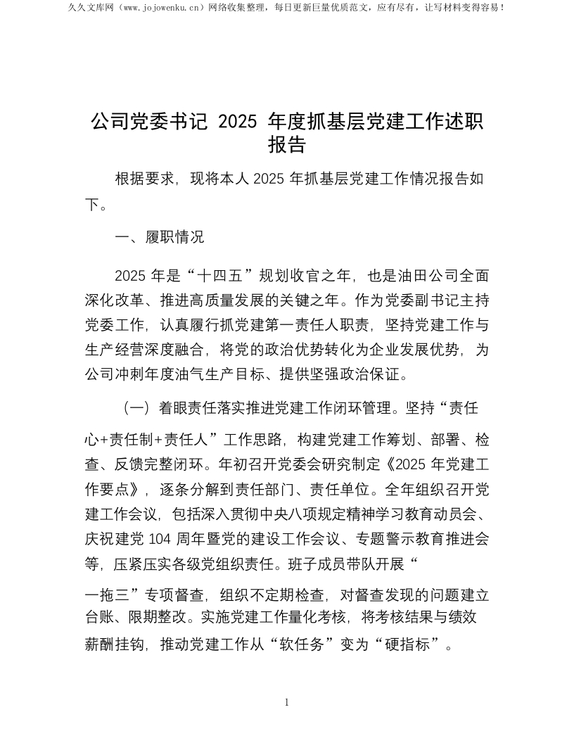 公司党委书记2025年度抓基层党建工作述职报告