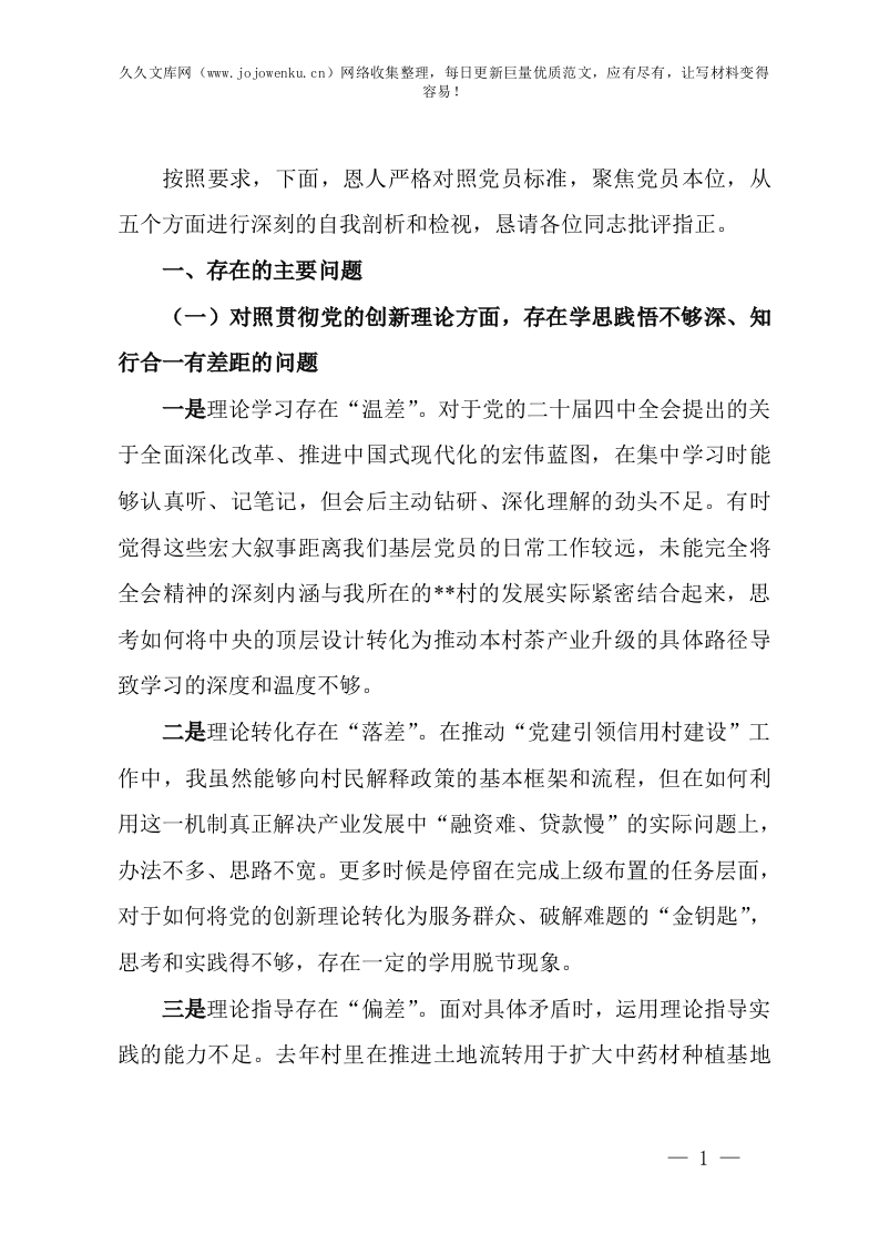 基层党员2025年度组织生活会个人对照检查材料(五个对照)