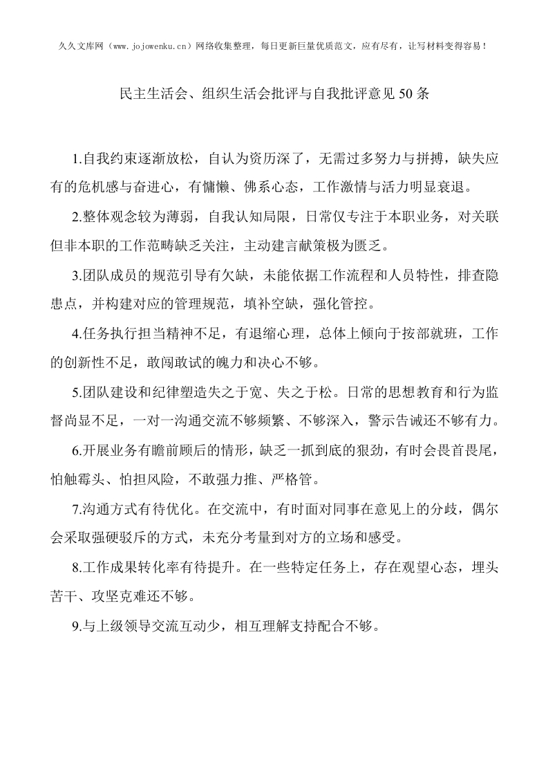 首页公文大全组织生活会民主生活会、组织生活会批评与自我批评意见50条