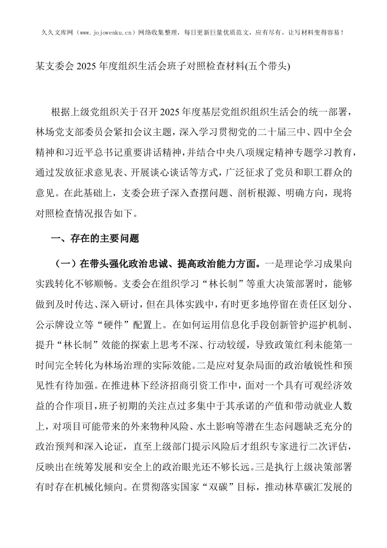 首页公文大全组织生活会某支委会2025年度组织生活会班子对照检查材料