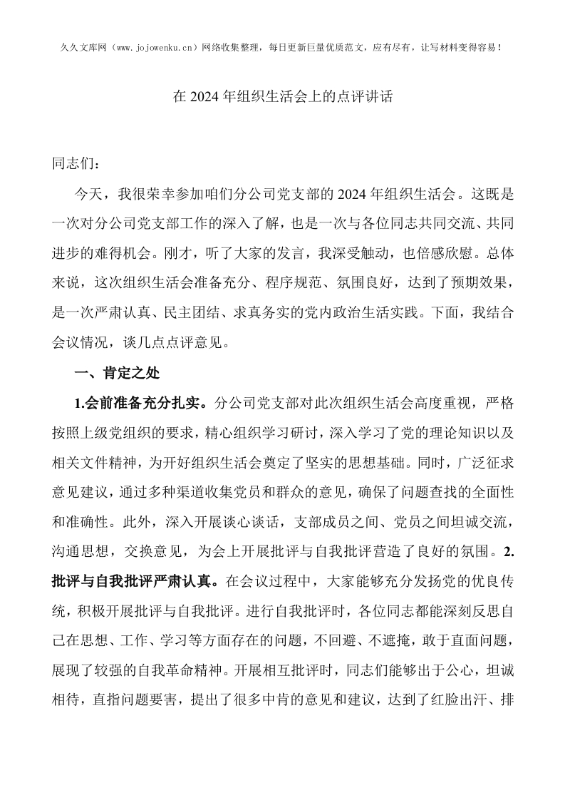 在2024年组织生活会上的点评讲话
