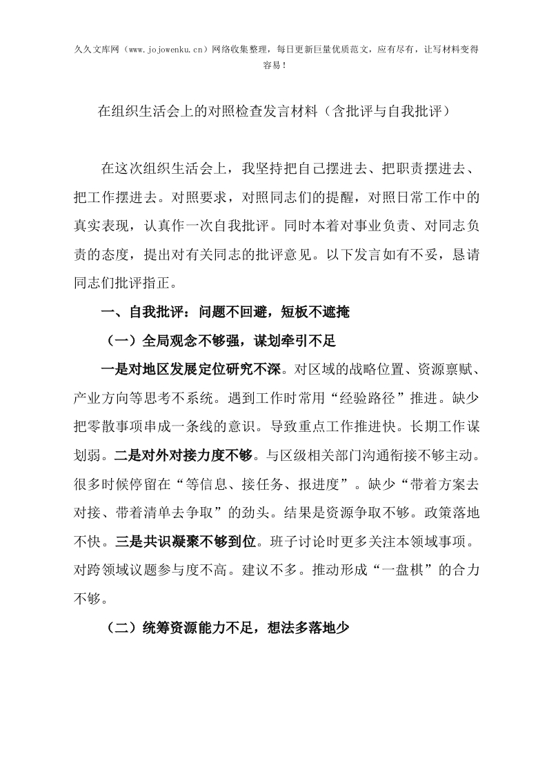 在组织生活会上的对照检查发言材料(含批评与自我批评) (1)