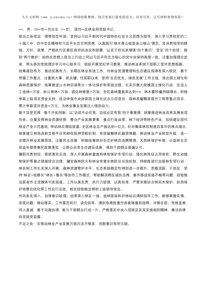 首页公文大全申请入党等党务材料现实表现区林业局党组书记现实表现材料