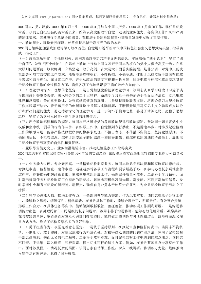 县纪委常委现实表现材料