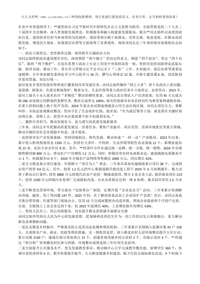 首页公文大全申请入党等党务材料现实表现镇长提拔考察近三年现实表现材料(2023-2025)