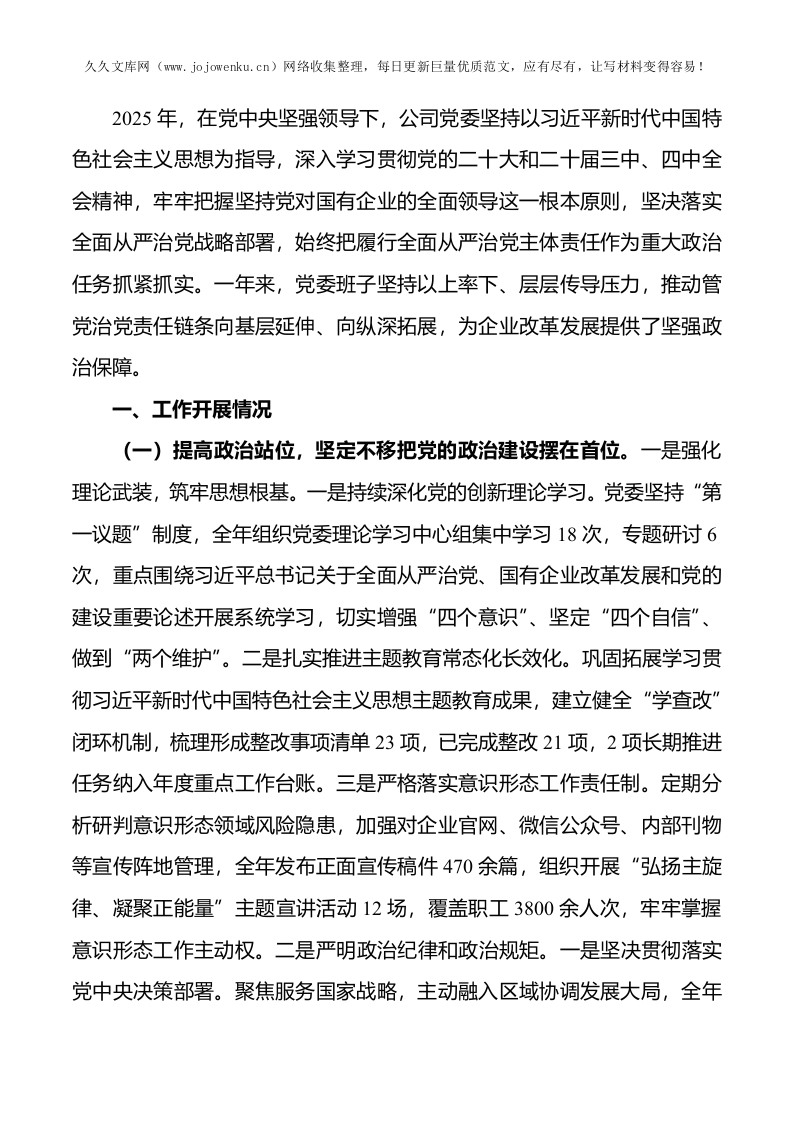 某国企党委2025年落实全面从严治党主体责任工作总结