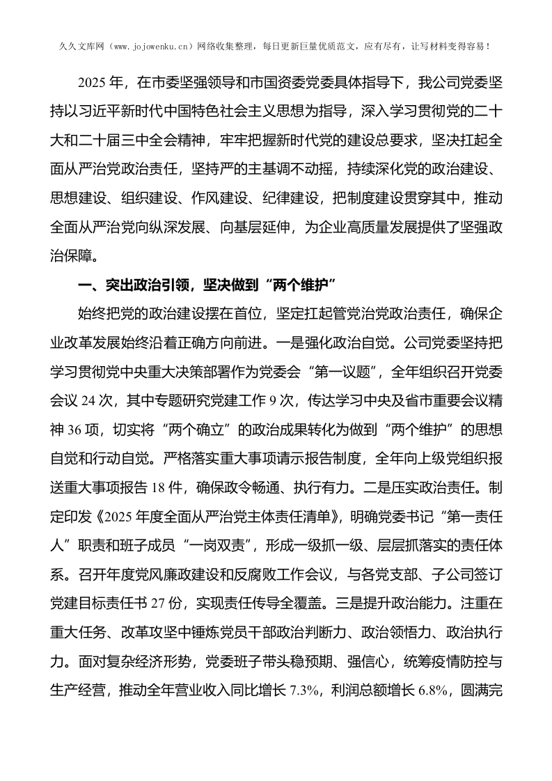 某市国有企业党委2025年落实全面从严治党主体责任工作总结