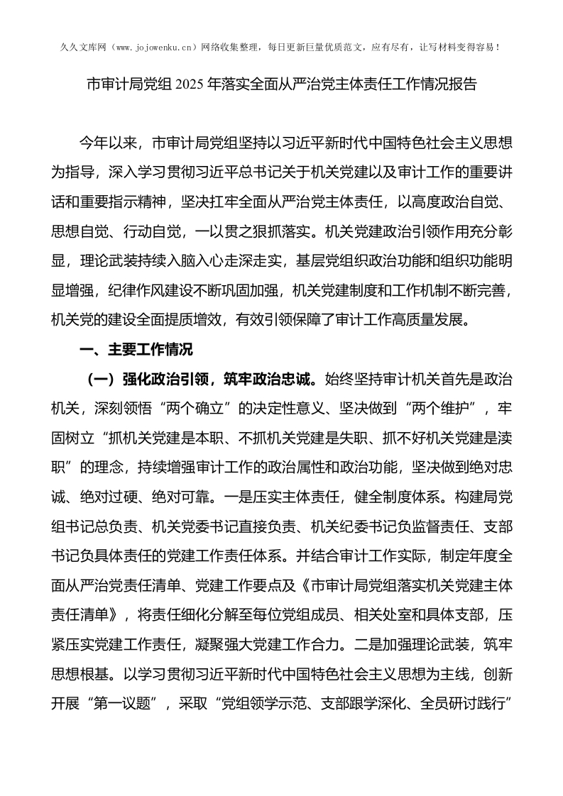 市审计局党组2025年落实全面从严治党主体责任工作情况报告