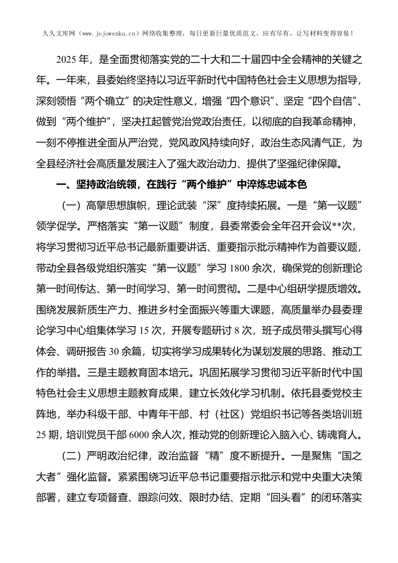 首页公文大全总结报告报告县委2025年度履行全面从严治党主体责任情况的报告