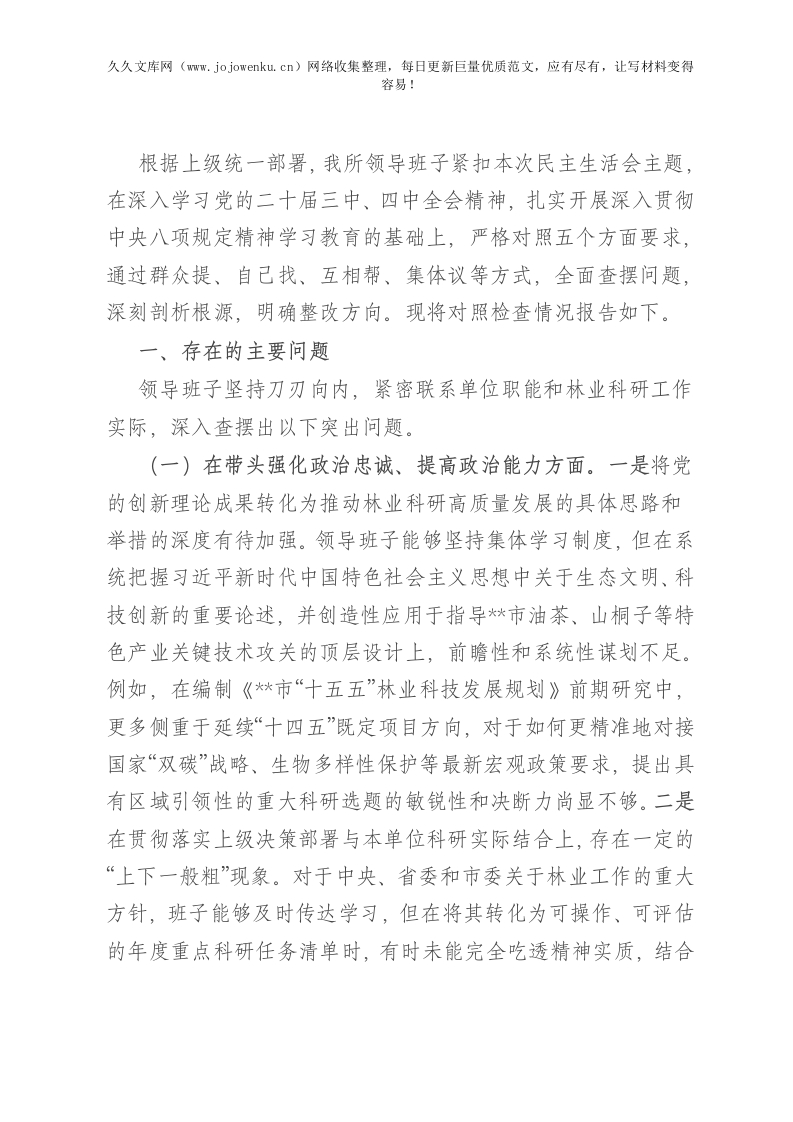 研究所领导班子2025年度民主生活会对照检查材料(五个带头)