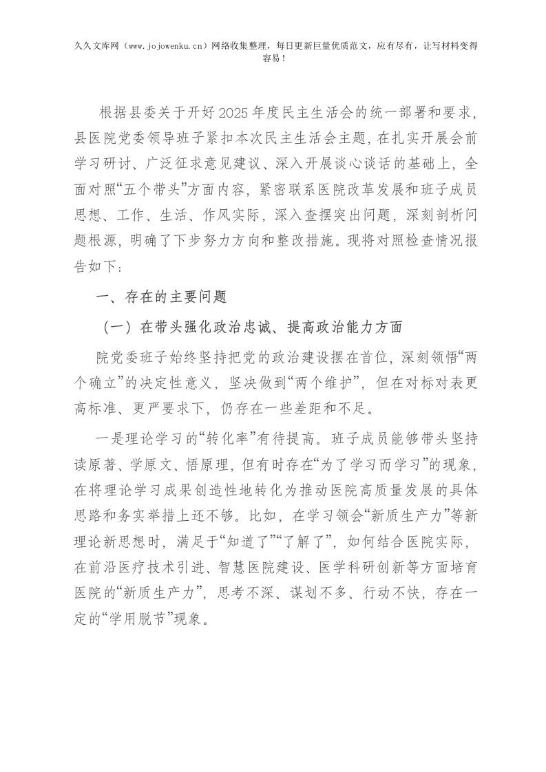 首页公文大全民主生活会医院党委领导班子2025年度民主生活会对照检查材料