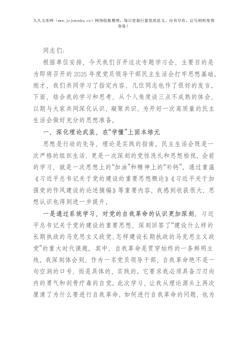 在学校民主生活会专题学习会上研讨发言材料